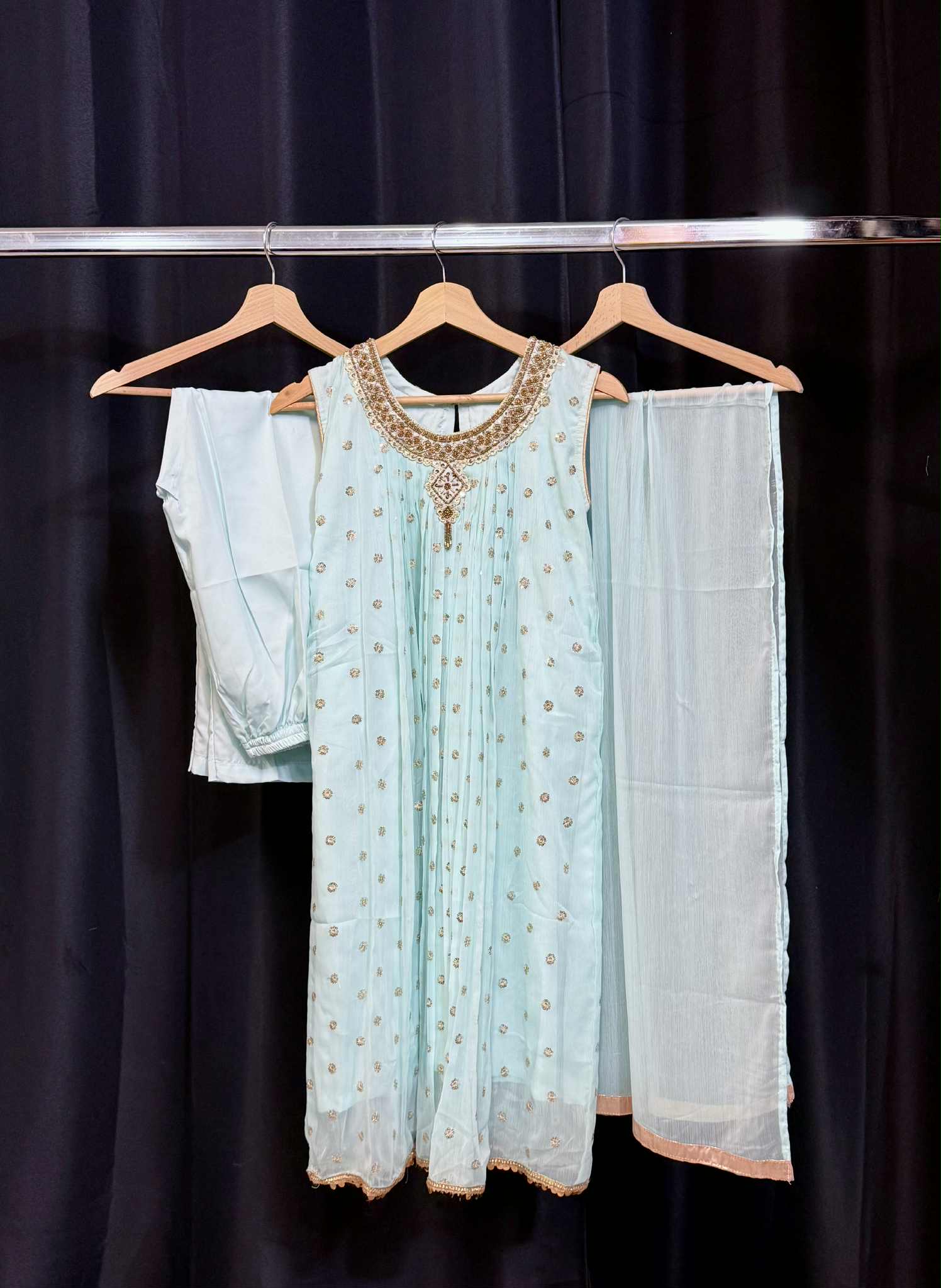 Driedelige set bestaande uit maxi jurk, dupatta en broek. Mouwen krijg je er los bij.
