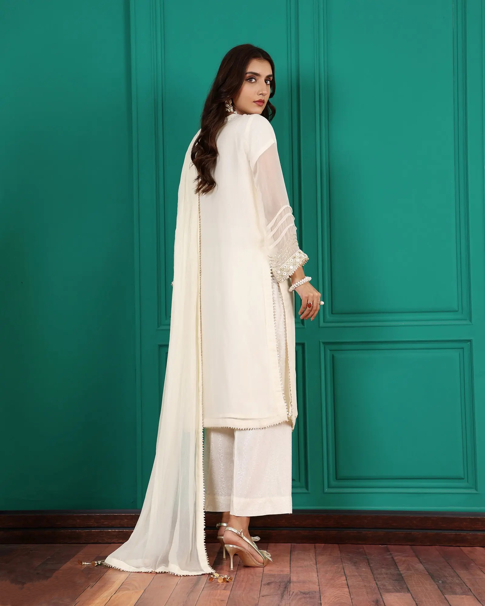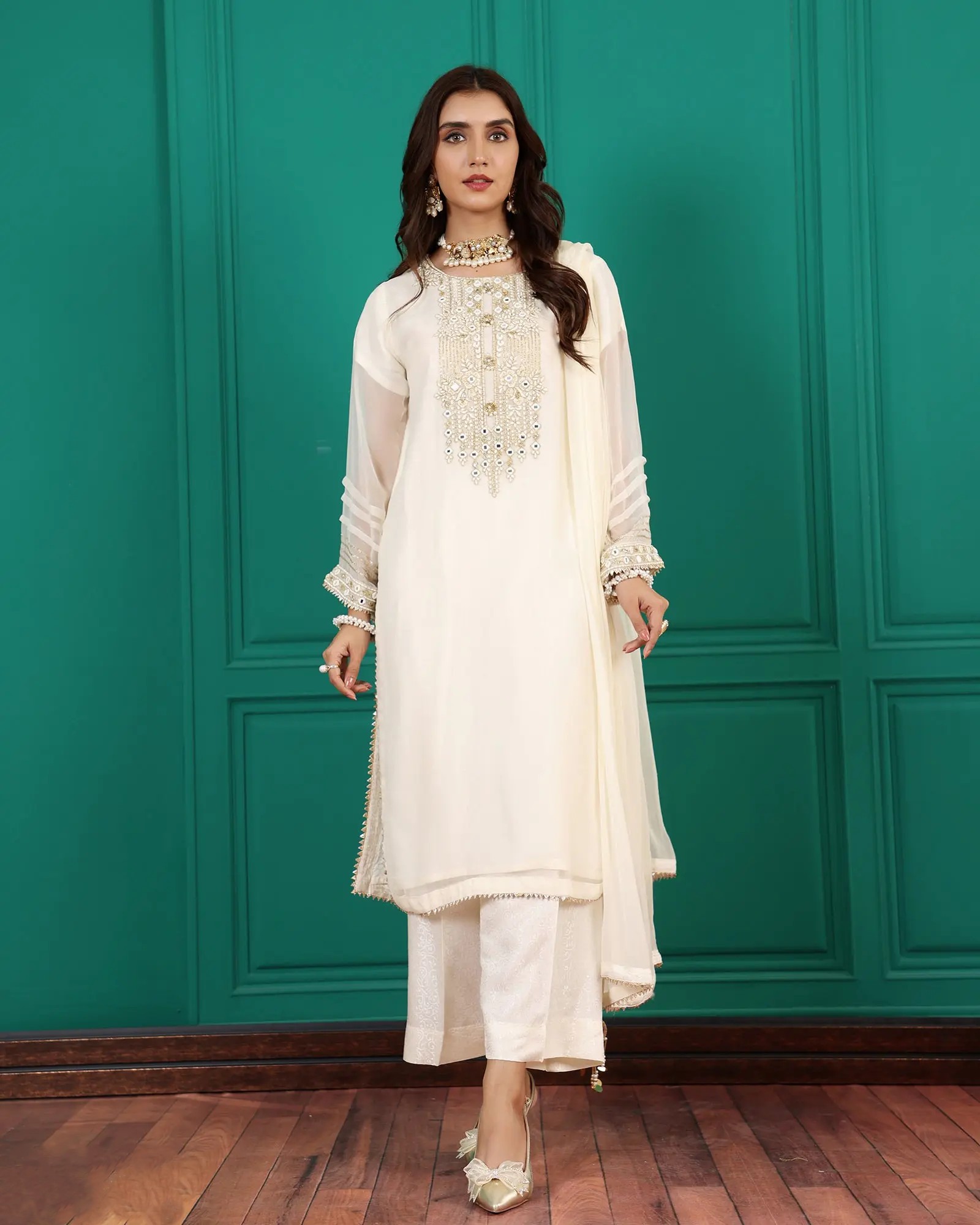 De kameez is bewerkt met tila, pailletten, draad en spiegeltjes.