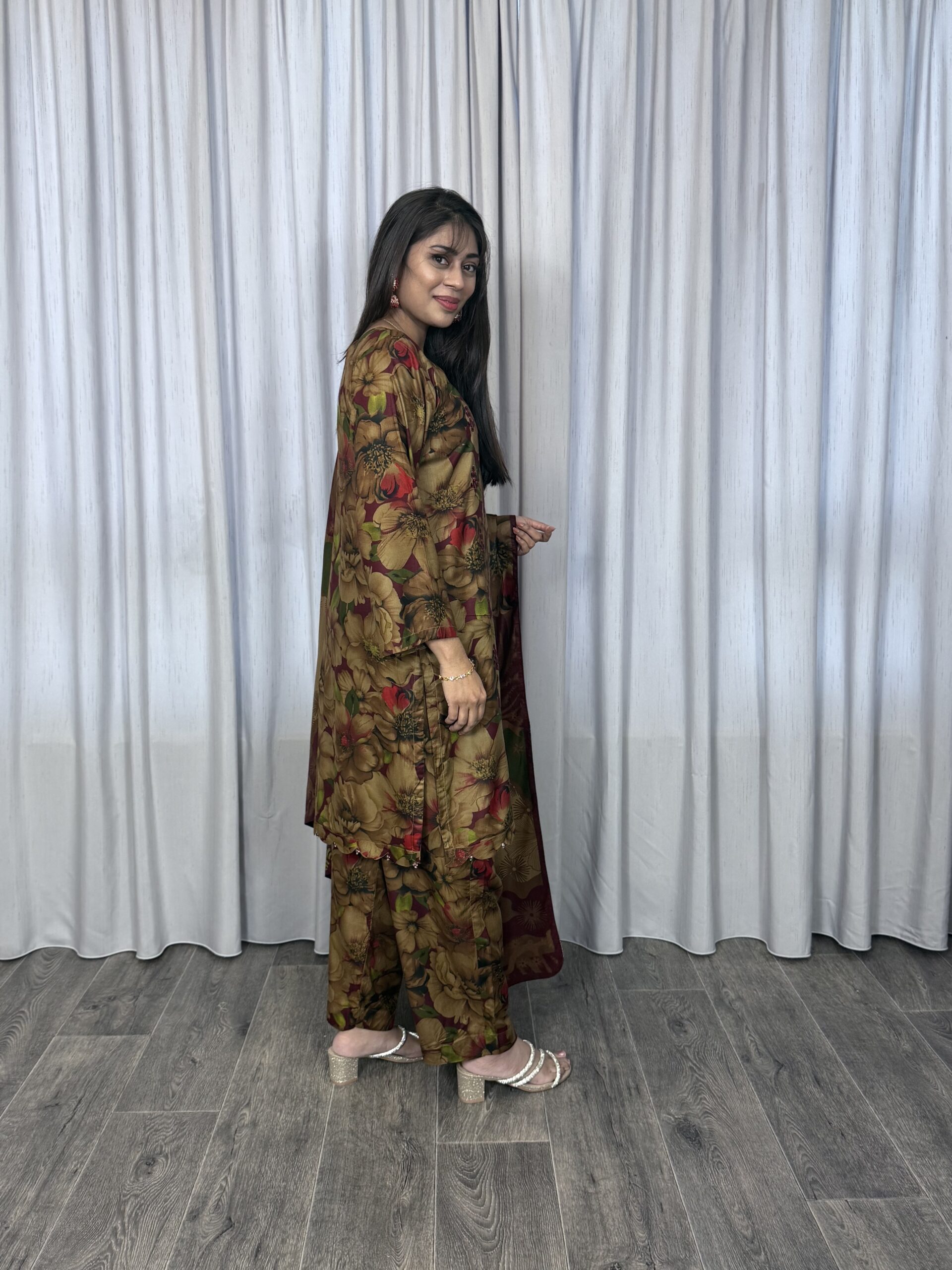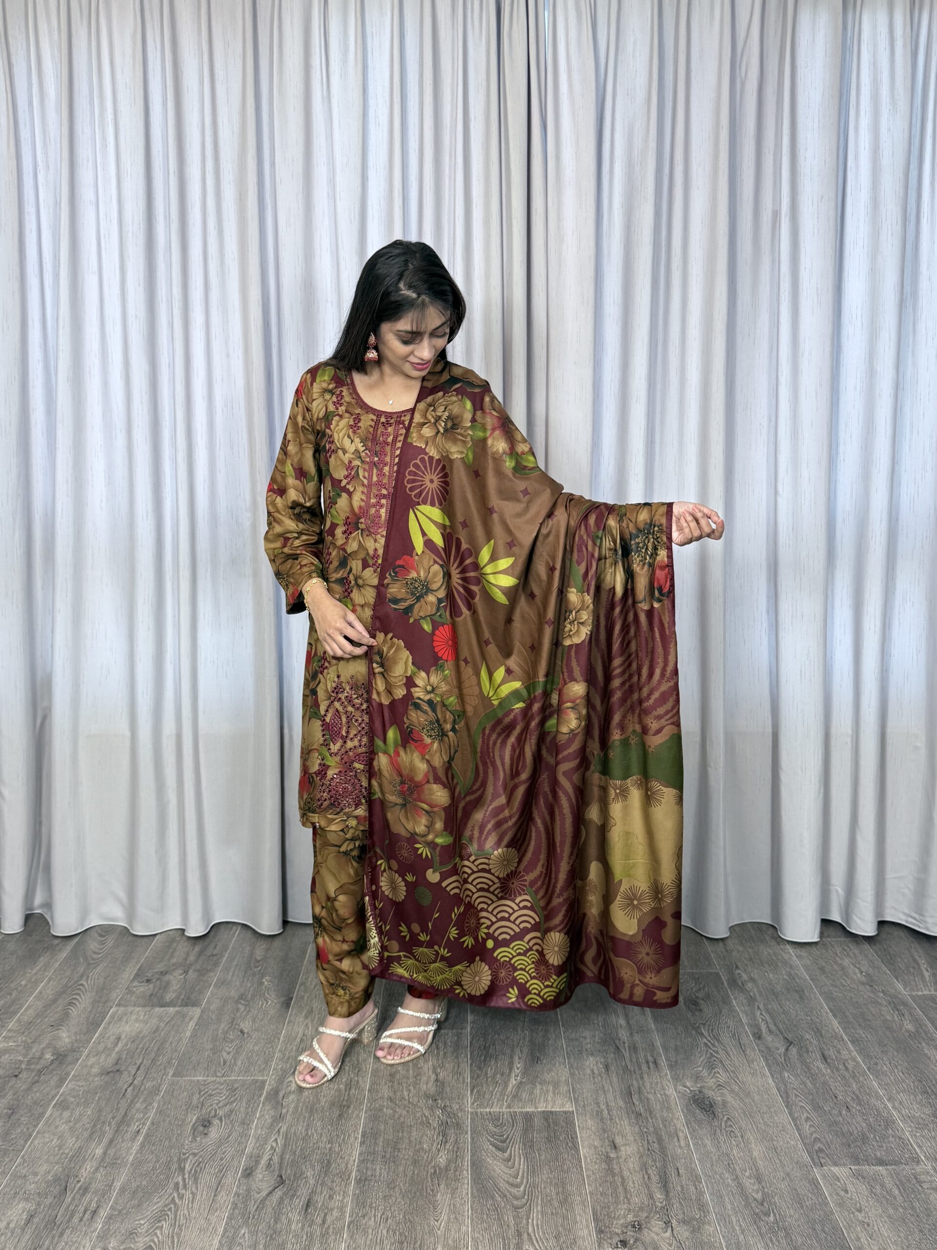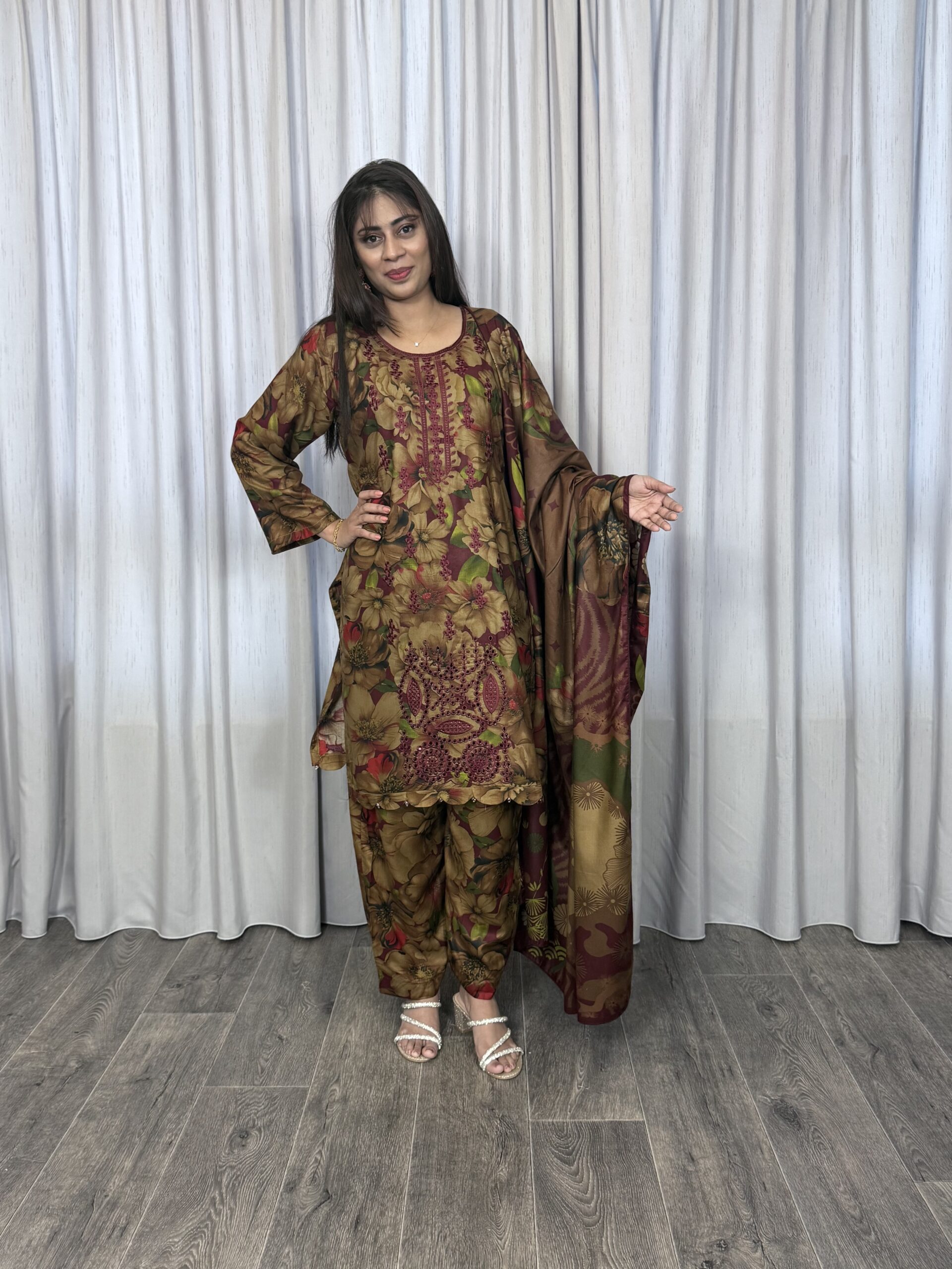 Art soft linnen embroided chickenkari Pakistaanse suit driedelig. Soft linnen heeft een zachte afwerking, is comfortabel en kreukt niet snel. De stof zelf is gemaakt van vlasvezels in