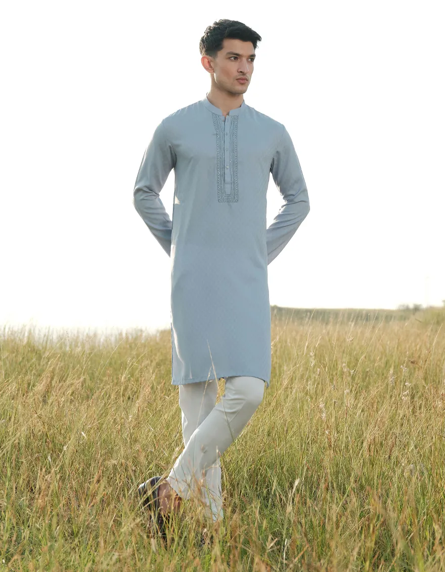 Katoenen kurta wit met grijsblauwe ondertoon met ban gala