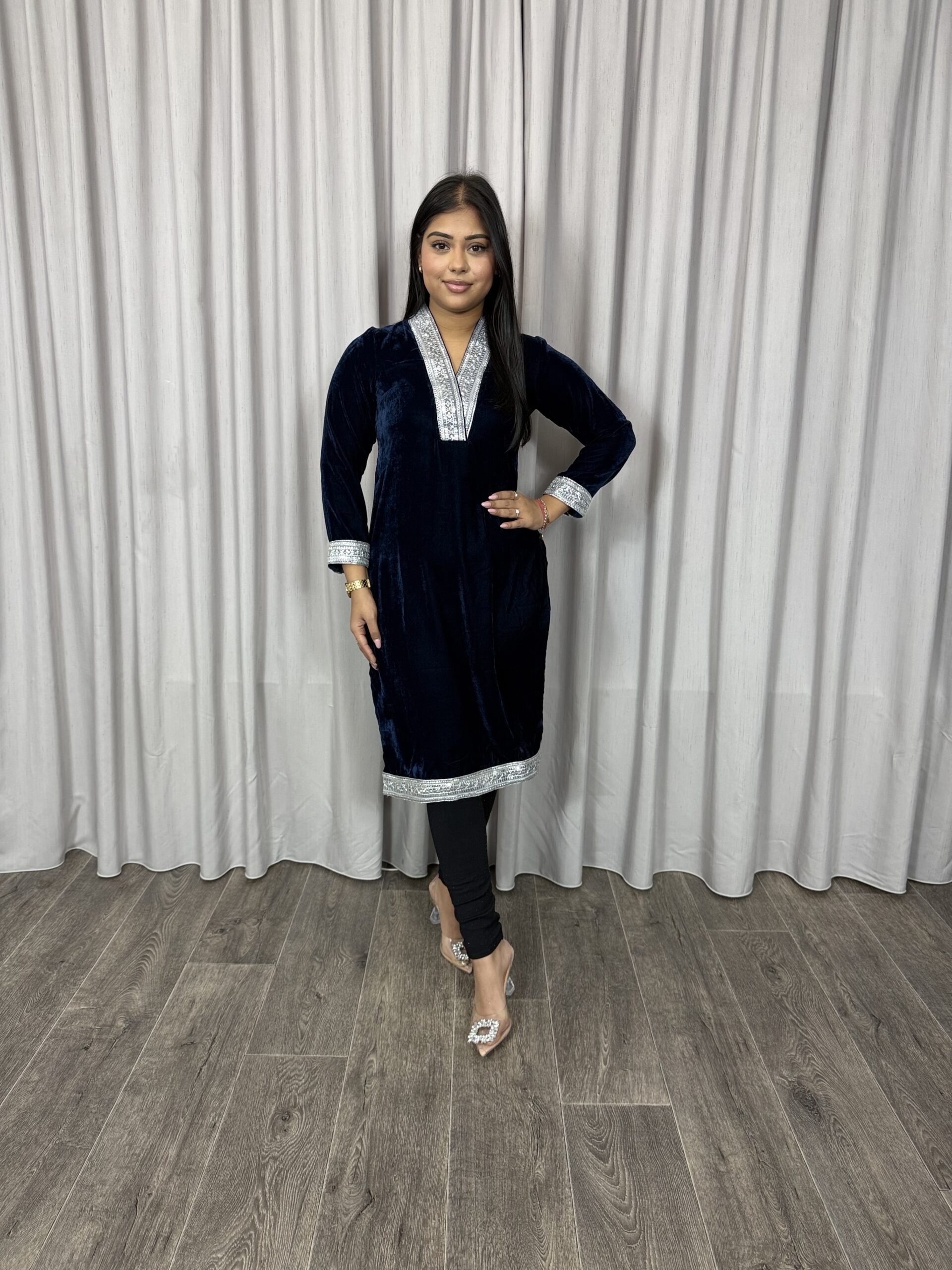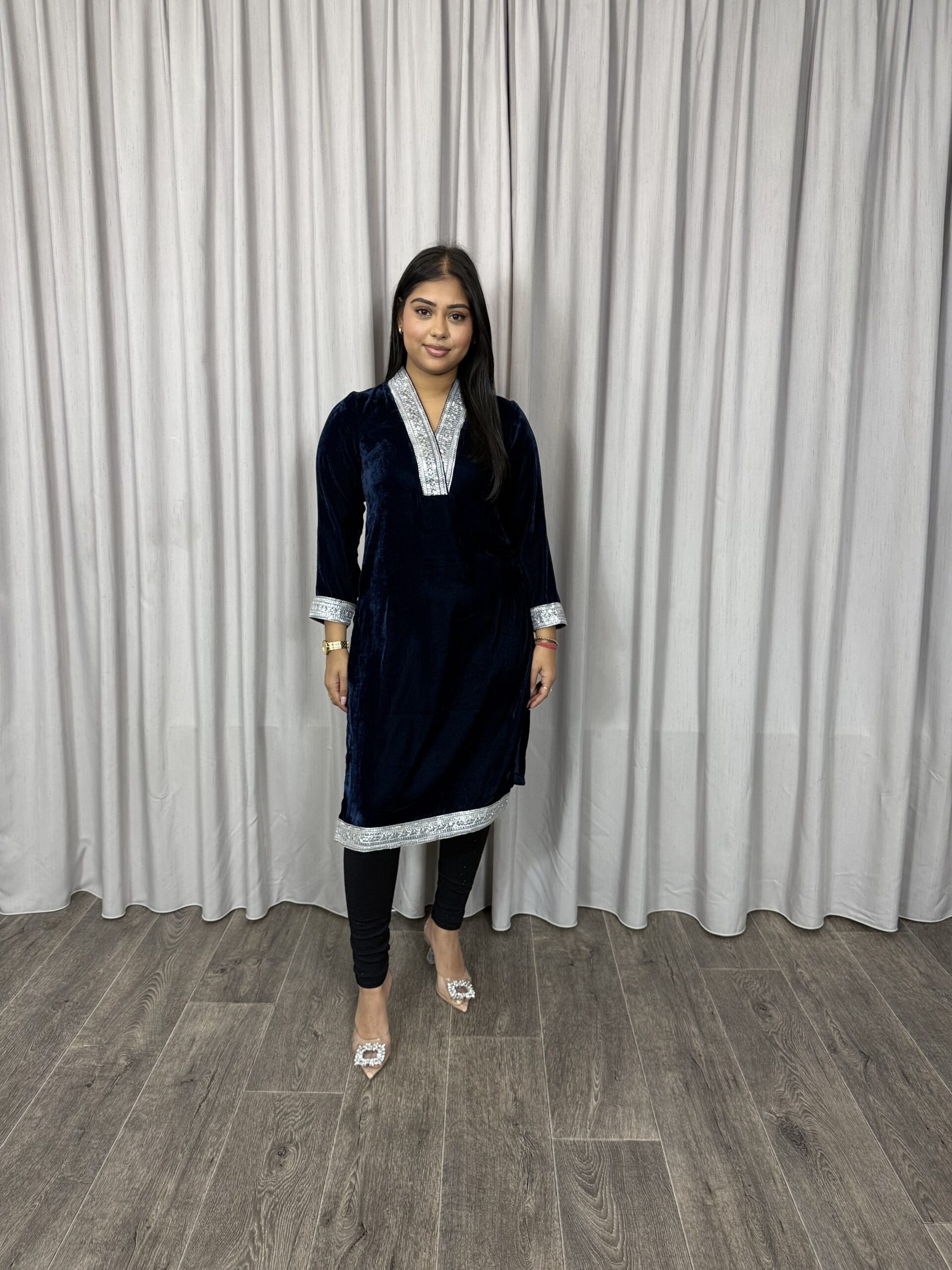 Velvet kurta met zilveren lace op hals, mouw en daman.